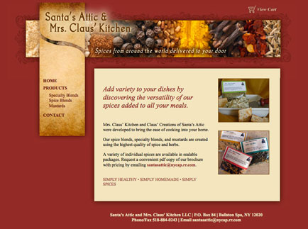 Santa's Attic & Mrs. Claus' Kitchen creates specialty spice blends, rubs, and mustards. Their website includes a shopping cart for online ordering.